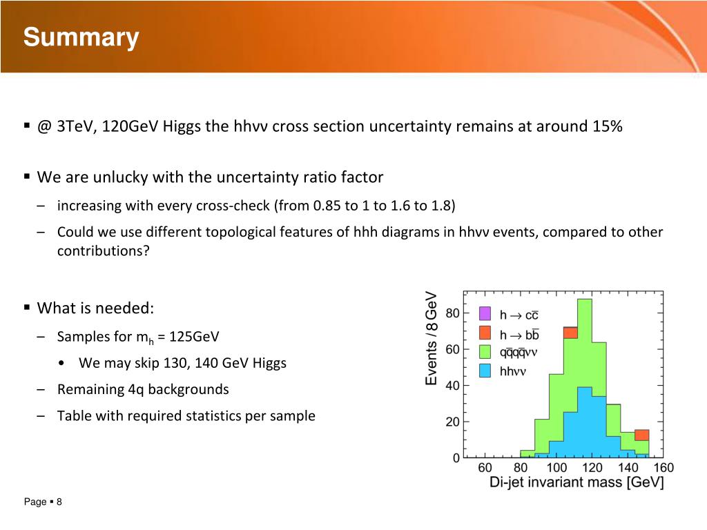 Brief summary from the last presentation • Cross-check uncertainty relating factor (for hhνν channel): It turns out it is rather around 1, when including Z-diagrams(checked with CalcHEP2.4) • Unfortunately, @ 3TeV the situation is worse and the factor is around 1.6 • The best achieved cross-section uncertainty around 14.6%-16% depending on the neural net training and the uncertainty evaluation method. • This would lead to λhhh uncertainty of around 23.4%-25.6%, i.e. not as good as we hoped for. @ 1TeV