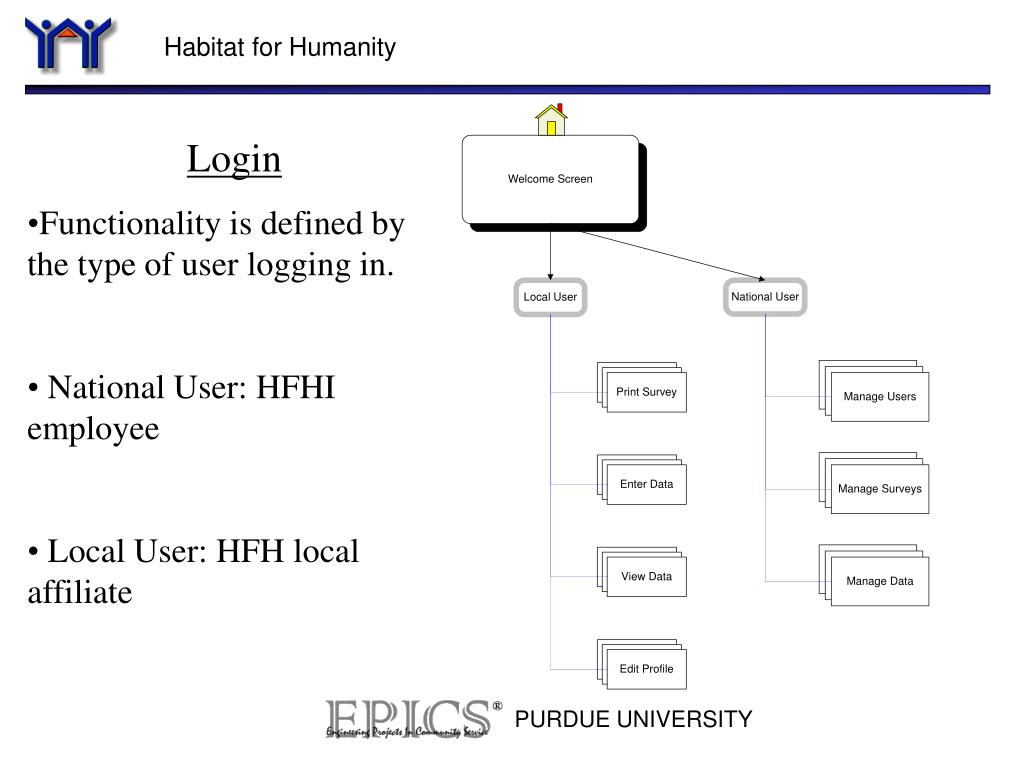 Login • Functionality is defined by the type of user logging in. • National User: HFHI employee • Local User: HFH local affiliate PURDUE UNIVERSITY