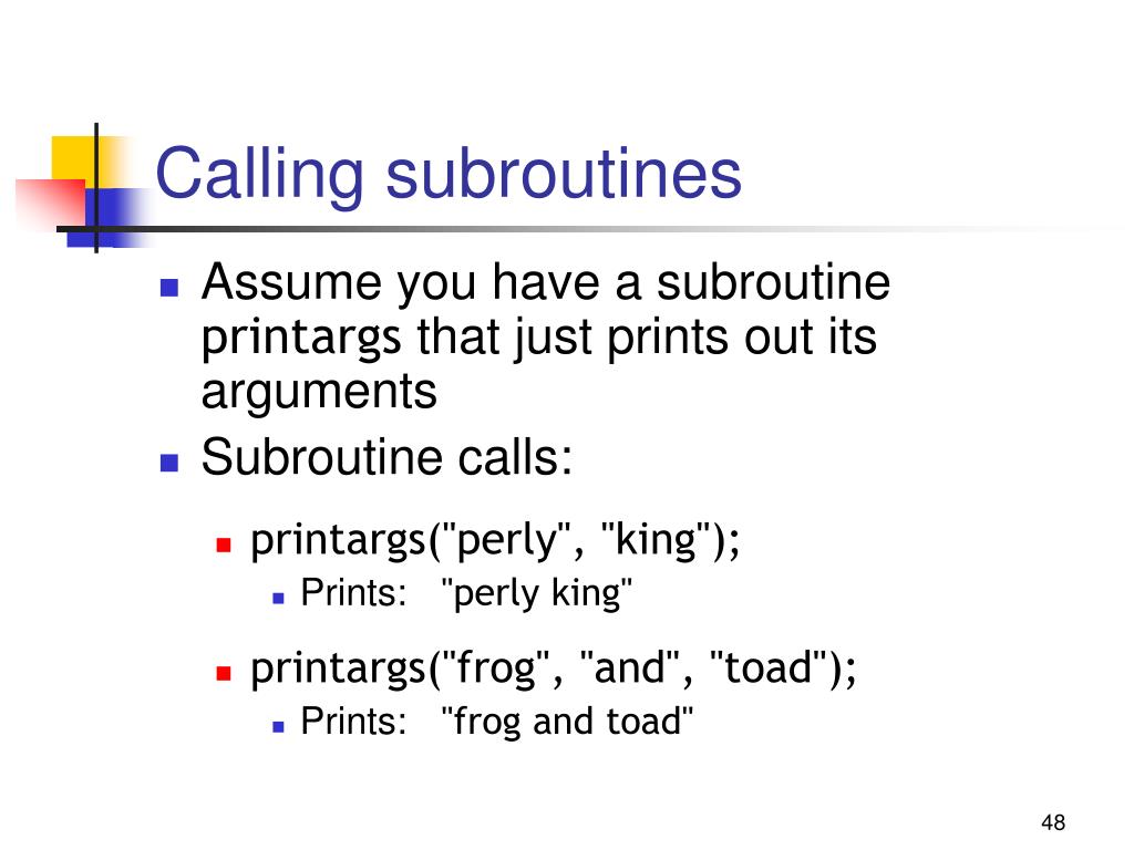 Calling subroutines • Assume you have a subroutine printargs that just prints out its arguments • Subroutine calls: • printargs("perly", "king"); • Prints: "perly king" • printargs("frog", "and", "toad"); • Prints: "frog and toad"