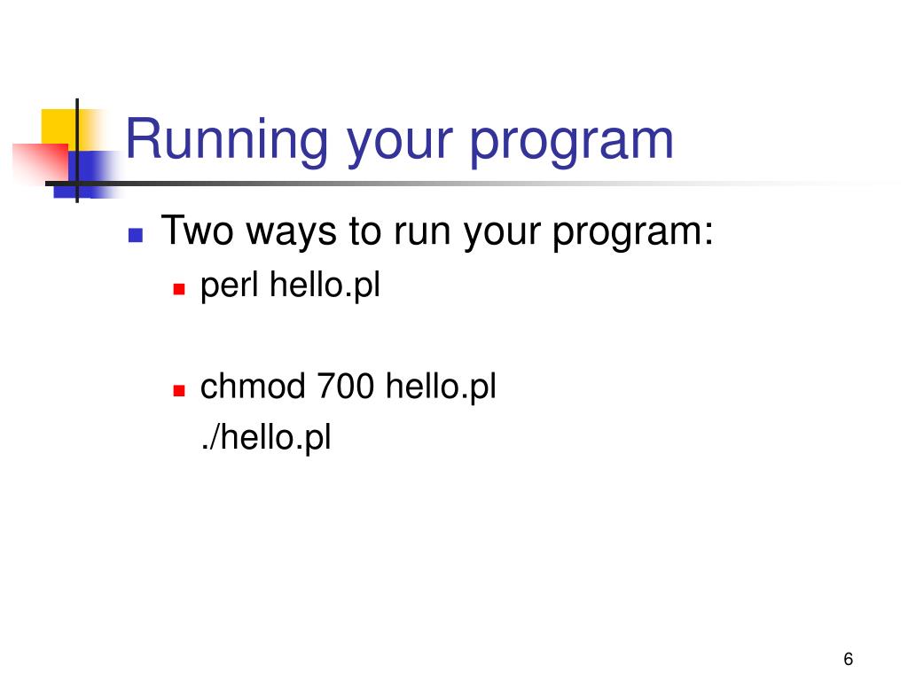 Running your program • Two ways to run your program: • perl hello.pl • chmod 700 hello.pl ./hello.pl