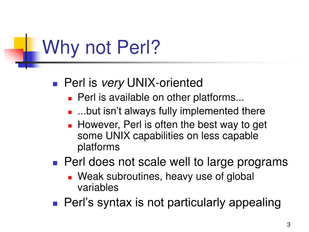 Why not Perl? • Perl is very UNIX-oriented • Perl is available on other platforms... • ...but isn’t always fully implemented there • However, Perl is often the best way to get some UNIX capabilities on less capable platforms • Perl does not scale well to large programs • Weak subroutines, heavy use of global variables • Perl’s syntax is not particularly appealing