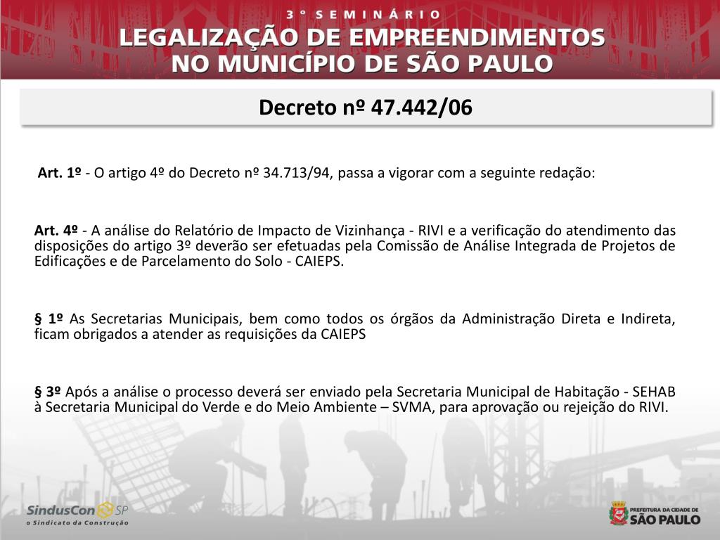 Art. 1º - O artigo 4º do Decreto nº 34.713/94, passa a vigorar com a seguinte redação: Art. 4º - A análise do Relatório de Impacto de Vizinhança - RIVI e a verificação do atendimento das disposições do artigo 3º deverão ser efetuadas pela Comissão de Análise Integrada de Projetos de Edificações e de Parcelamento do Solo - CAIEPS. § 1º As Secretarias Municipais, bem como todos os órgãos da Administração Direta e Indireta, ficam obrigados a atender as requisições da CAIEPS § 3º Após a análise o processo deverá ser enviado pela Secretaria Municipal de Habitação - SEHAB à Secretaria Municipal do Verde e do Meio Ambiente – SVMA, para aprovação ou rejeição do RIVI. Decreto nº 47.442/06