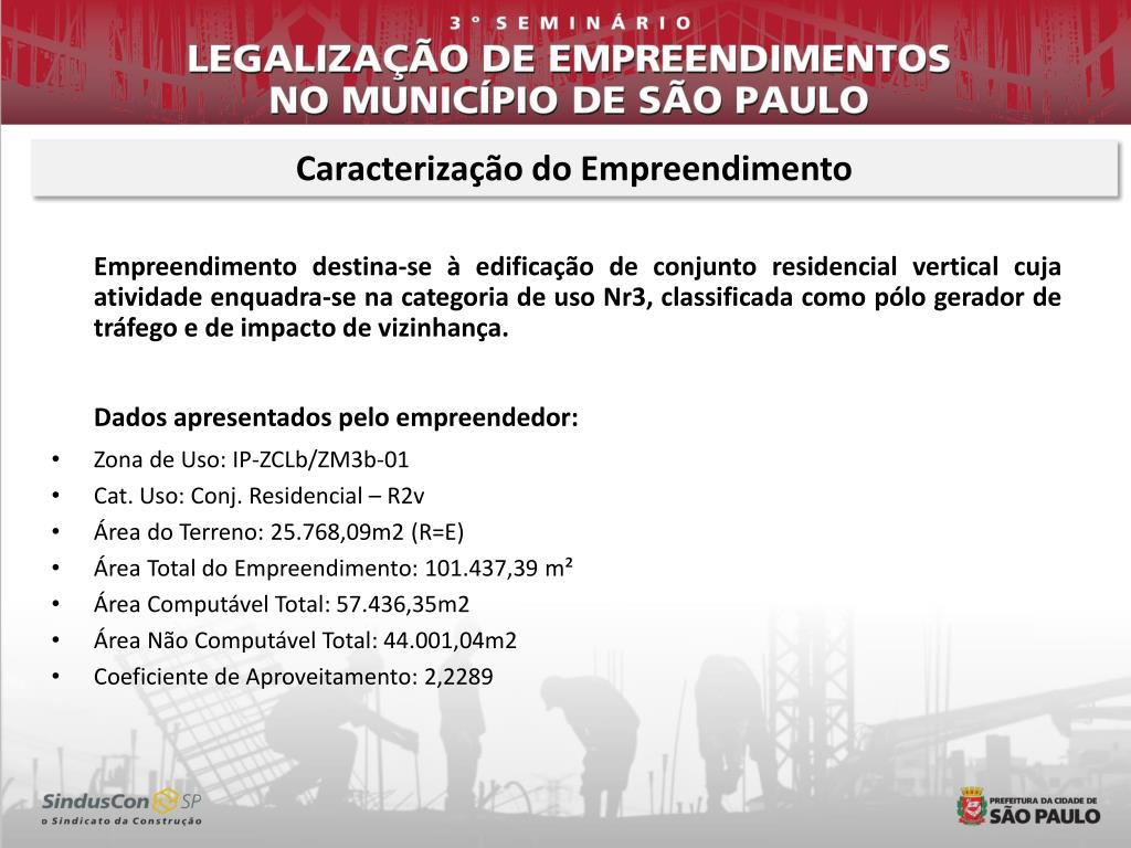 Empreendimento destina-se à edificação de conjunto residencial vertical cuja atividade enquadra-se na categoria de uso Nr3, classificada como pólo gerador de tráfego e de impacto de vizinhança. Dados apresentados pelo empreendedor: Zona de Uso: IP-ZCLb/ZM3b-01 Cat. Uso: Conj. Residencial – R2v Área do Terreno: 25.768,09m2 (R=E) Área Total do Empreendimento: 101.437,39 m² Área Computável Total: 57.436,35m2 Área Não Computável Total: 44.001,04m2 Coeficiente de Aproveitamento: 2,2289 Caracterização do Empreendimento
