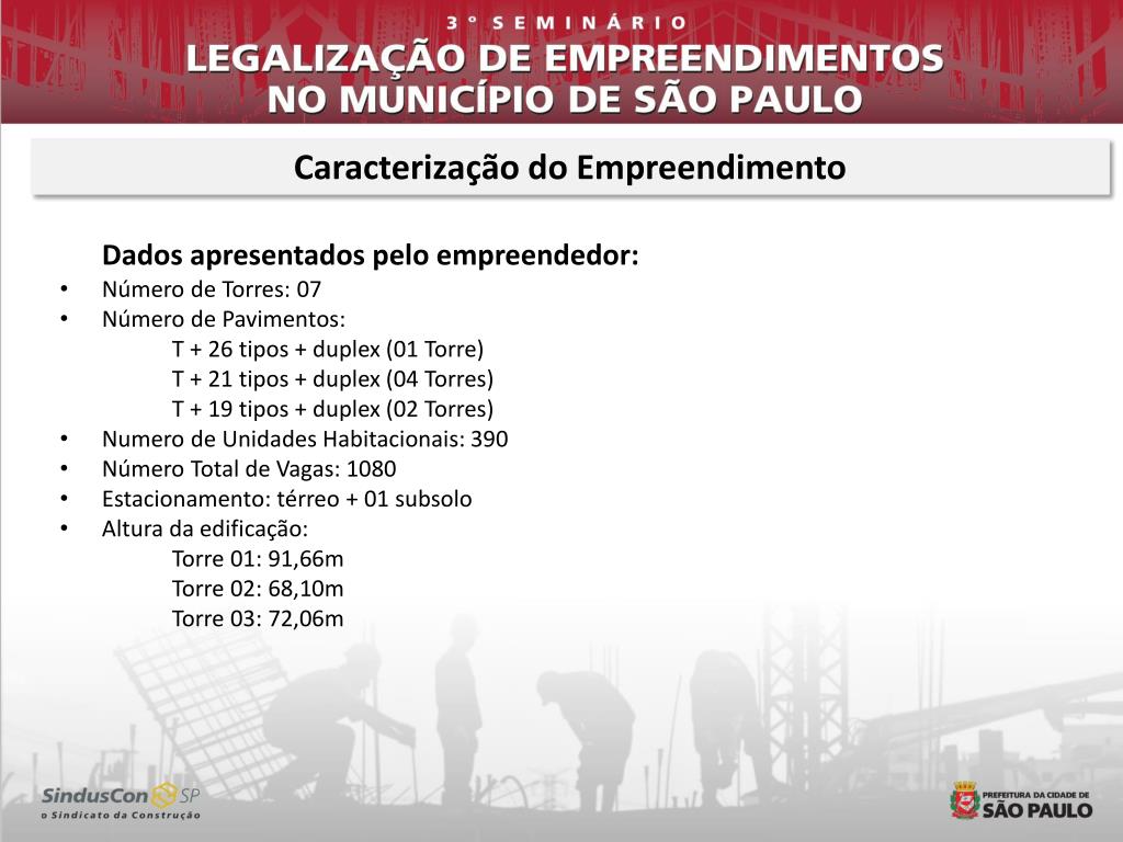 Dados apresentados pelo empreendedor: Número de Torres: 07 Número de Pavimentos: T + 26 tipos + duplex (01 Torre) T + 21 tipos + duplex (04 Torres) T + 19 tipos + duplex (02 Torres) Numero de Unidades Habitacionais: 390 Número Total de Vagas: 1080 Estacionamento: térreo + 01 subsolo Altura da edificação: Torre 01: 91,66m Torre 02: 68,10m Torre 03: 72,06m Caracterização do Empreendimento