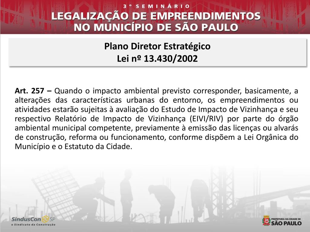 Art. 257 – Quando o impacto ambiental previsto corresponder, basicamente, a alterações das características urbanas do entorno, os empreendimentos ou atividades estarão sujeitas à avaliação do Estudo de Impacto de Vizinhança e seu respectivo Relatório de Impacto de Vizinhança (EIVI/RIV) por parte do órgão ambiental municipal competente, previamente à emissão das licenças ou alvarás de construção, reforma ou funcionamento, conforme dispõem a Lei Orgânica do Município e o Estatuto da Cidade. Plano Diretor Estratégico Lei nº 13.430/2002