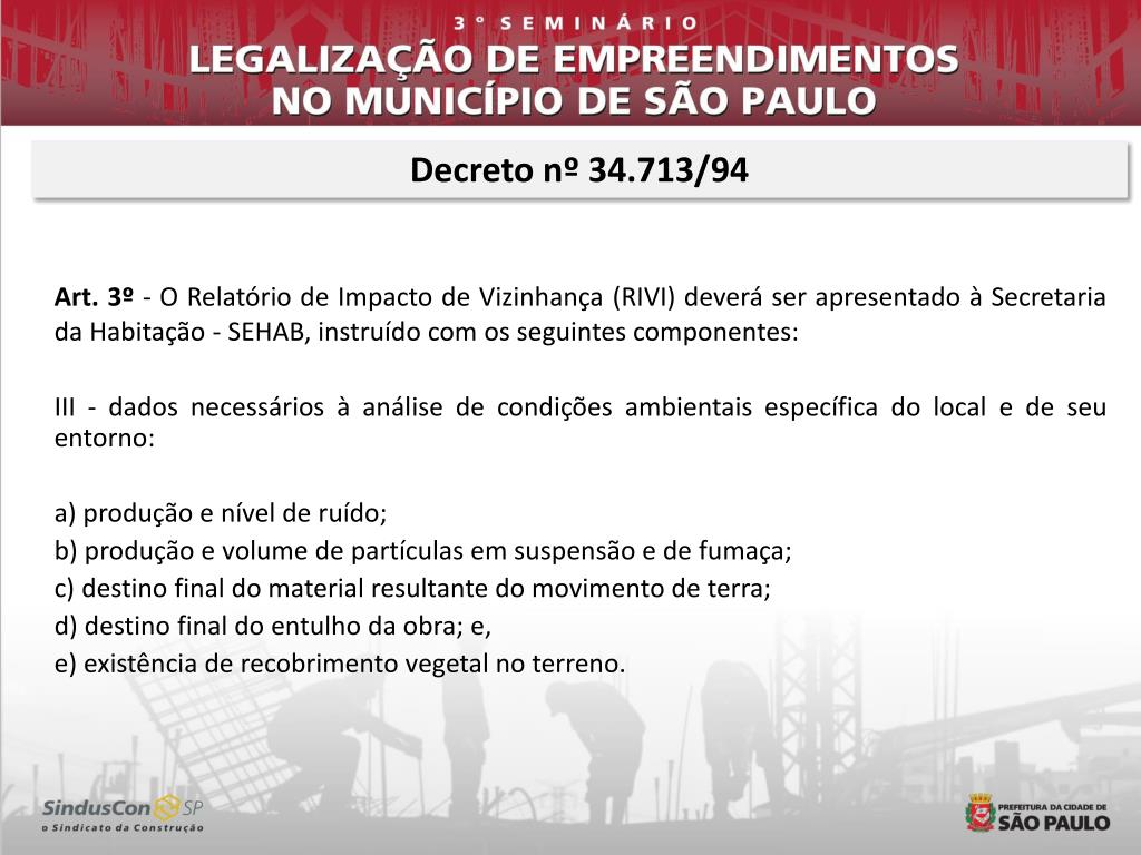 Art. 3º - O Relatório de Impacto de Vizinhança (RIVI) deverá ser apresentado à Secretaria da Habitação - SEHAB, instruído com os seguintes componentes: III - dados necessários à análise de condições ambientais específica do local e de seu entorno: a) produção e nível de ruído; b) produção e volume de partículas em suspensão e de fumaça; c) destino final do material resultante do movimento de terra; d) destino final do entulho da obra; e, e) existência de recobrimento vegetal no terreno. Decreto nº 34.713/94