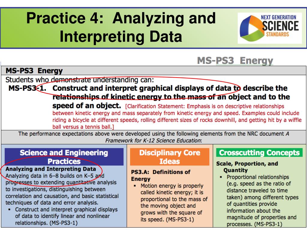 Practice 4: Analyzing and Interpreting Data Once collected, data must be presented in a form that can reveal any patterns and relationships and that allows results to be communicated to others. Because raw data as such have little meaning, a major practice of scientists is to organize and interpret data through tabulating, graphing, or statistical analysis. Such analysis can bring out the meaning of data—and their relevance—so that they may be used as evidence. Engineers, too, make decisions based on evidence that a given design will work; they rarely rely on trial and error. (NRC Framework, 2012, p. 61-62)