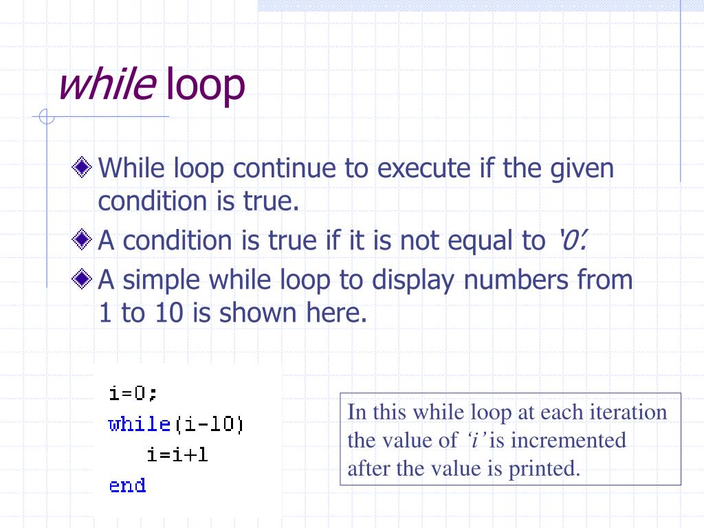 while loop • While loop continue to execute if the given condition is true. • A condition is true if it is not equal to ‘0’. • A simple while loop to display numbers from 1 to 10 is shown here. In this while loop at each iteration the value of ‘i’ is incremented after the value is printed.