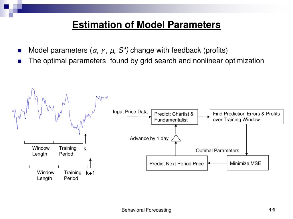 Input Price Data Find Prediction Errors & Profits over Training Window Predict: Chartist & Fundamentalist Advance by 1 day Optimal Parameters Minimize MSE Predict Next Period Price Window Length Training Period k Window Length Training Period k+1 Estimation of Model Parameters • Model parameters (, , µ, S*) change with feedback (profits) • The optimal parameters found by grid search and nonlinear optimization Behavioral Forecasting