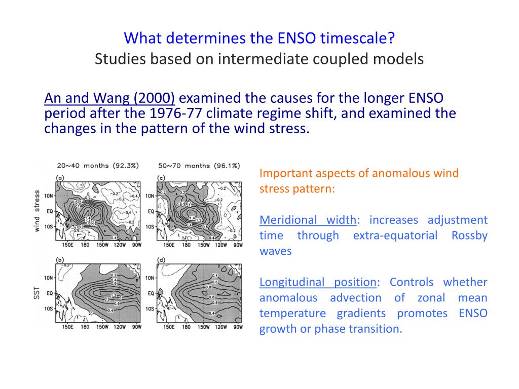 What determines the ENSO timescale?Studies based on intermediate coupled models An and Wang (2000) examined the causes for the longer ENSO period after the 1976-77 climate regime shift, and examined the changes in the pattern of the wind stress. Important aspects of anomalous wind stress pattern: Meridional width: increases adjustment time through extra-equatorial Rossby waves Longitudinal position: Controls whether anomalous advection of zonal mean temperature gradients promotes ENSO growth or phase transition.