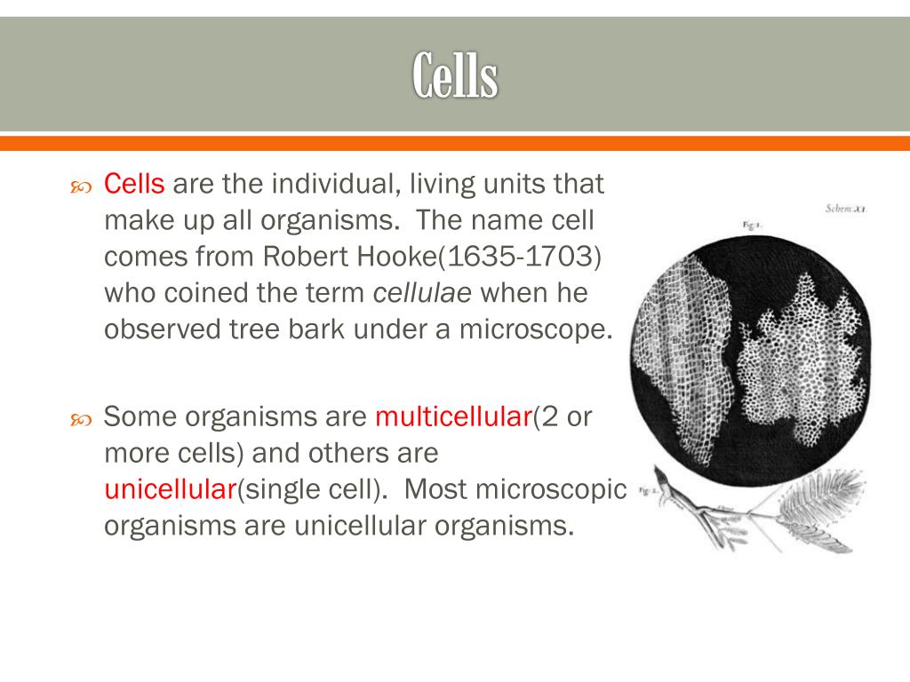 Cells • Cells are the individual, living units that make up all organisms. The name cell comes from Robert Hooke(1635-1703) who coined the term cellulae when he observed tree bark under a microscope. • Some organisms are multicellular(2 or more cells) and others are unicellular(single cell). Most microscopic organisms are unicellular organisms.