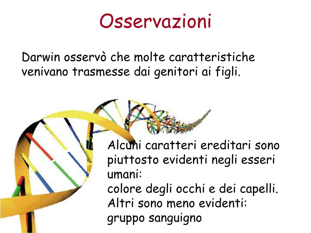 Osservazioni Darwin osservò che molte caratteristiche venivano trasmesse dai genitori ai figli. Alcuni caratteri ereditari sono piuttosto evidenti negli esseri umani: colore degli occhi e dei capelli. Altri sono meno evidenti: gruppo sanguigno