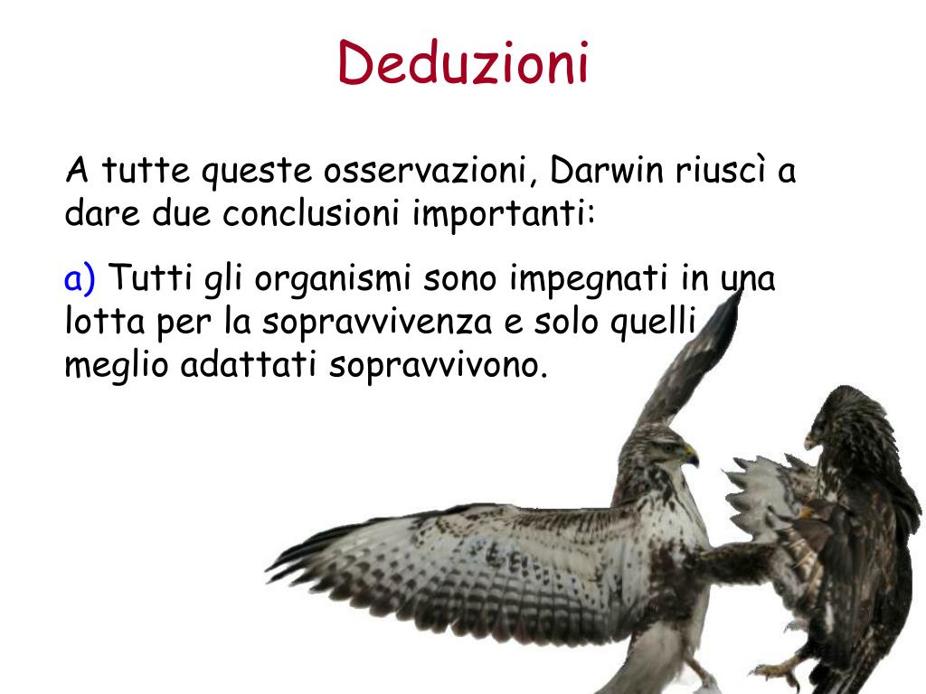 Deduzioni A tutte queste osservazioni, Darwin riuscì a dare due conclusioni importanti: a) Tutti gli organismi sono impegnati in una lotta per la sopravvivenza e solo quelli meglio adattati sopravvivono.
