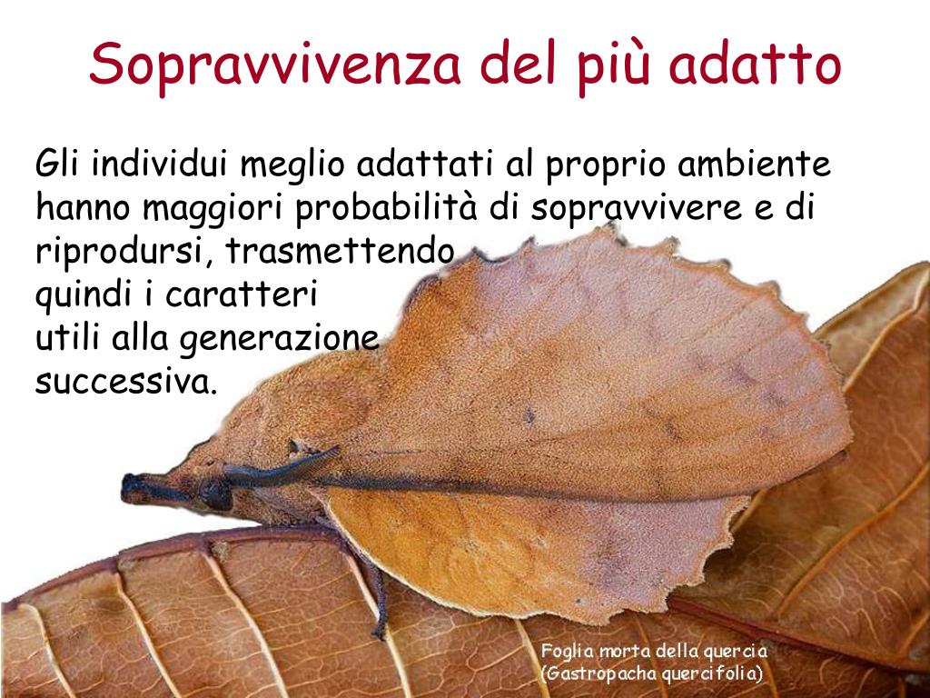 Sopravvivenza del più adatto Gli individui meglio adattati al proprio ambiente hanno maggiori probabilità di sopravvivere e di riprodursi, trasmettendo quindi i caratteri utili alla generazione successiva.