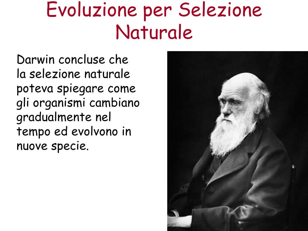 Evoluzione per Selezione Naturale Darwin concluse che la selezione naturale poteva spiegare come gli organismi cambiano gradualmente nel tempo ed evolvono in nuove specie.