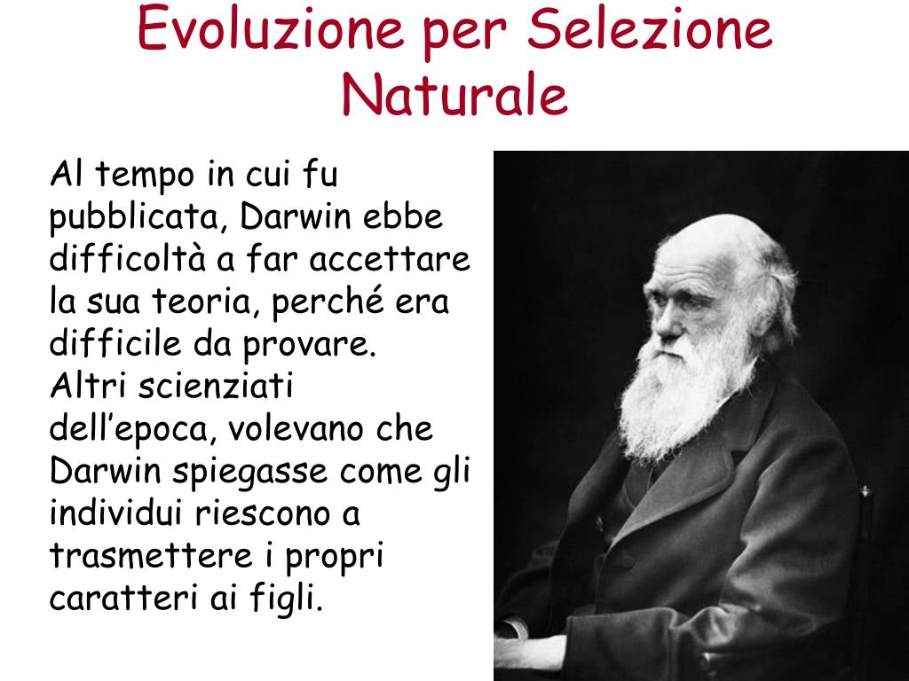 Evoluzione per Selezione Naturale Al tempo in cui fu pubblicata, Darwin ebbe difficoltà a far accettare la sua teoria, perché era difficile da provare. Altri scienziati dell’epoca, volevano che Darwin spiegasse come gli individui riescono a trasmettere i propri caratteri ai figli.