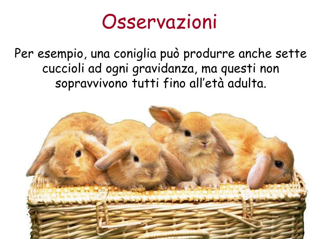 Osservazioni Per esempio, una coniglia può produrre anche sette cuccioli ad ogni gravidanza, ma questi non sopravvivono tutti fino all’età adulta.