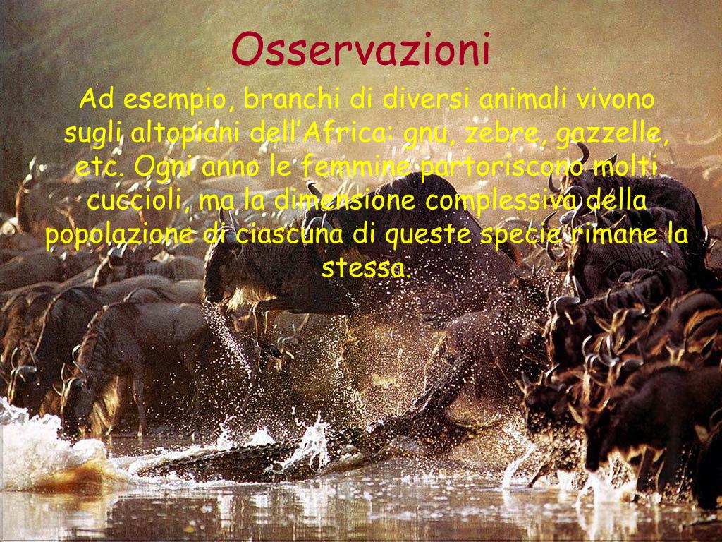 Osservazioni Ad esempio, branchi di diversi animali vivono sugli altopiani dell’Africa: gnu, zebre, gazzelle, etc. Ogni anno le femmine partoriscono molti cuccioli, ma la dimensione complessiva della popolazione di ciascuna di queste specie rimane la stessa.