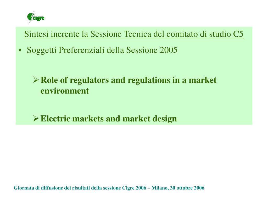 Sintesi inerente la Sessione Tecnica del comitato di studio C5 • Soggetti Preferenziali della Sessione 2005 • Role of regulators and regulations in a market environment • Electric markets and market design Giornata di diffusione dei risultati della sessione Cigre 2006 – Milano, 30 ottobre 2006