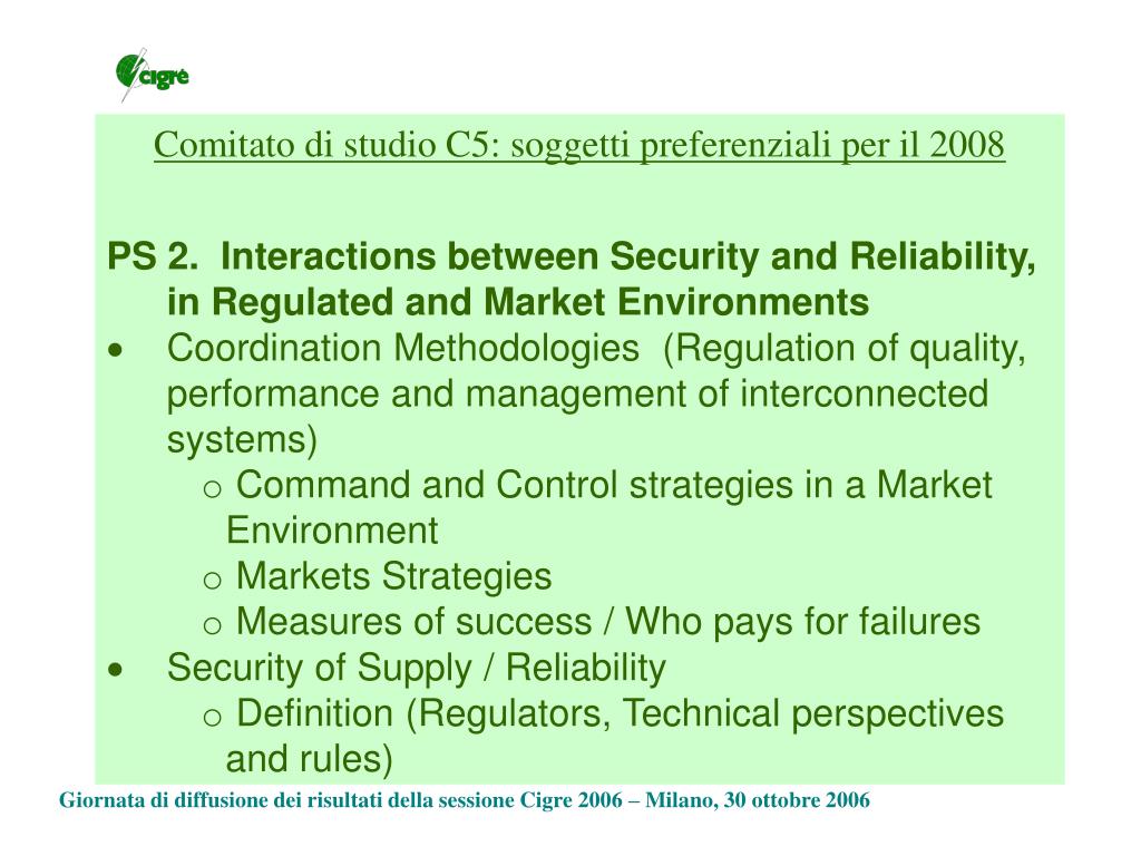 Comitato di studio C5: soggetti preferenziali per il 2008 • PS 2. Interactions between Security and Reliability, in Regulated and Market Environments • Coordination Methodologies (Regulation of quality, performance and management of interconnected systems) • Command and Control strategies in a Market Environment • Markets Strategies • Measures of success / Who pays for failures • Security of Supply / Reliability • Definition (Regulators, Technical perspectives and rules) Giornata di diffusione dei risultati della sessione Cigre 2006 – Milano, 30 ottobre 2006