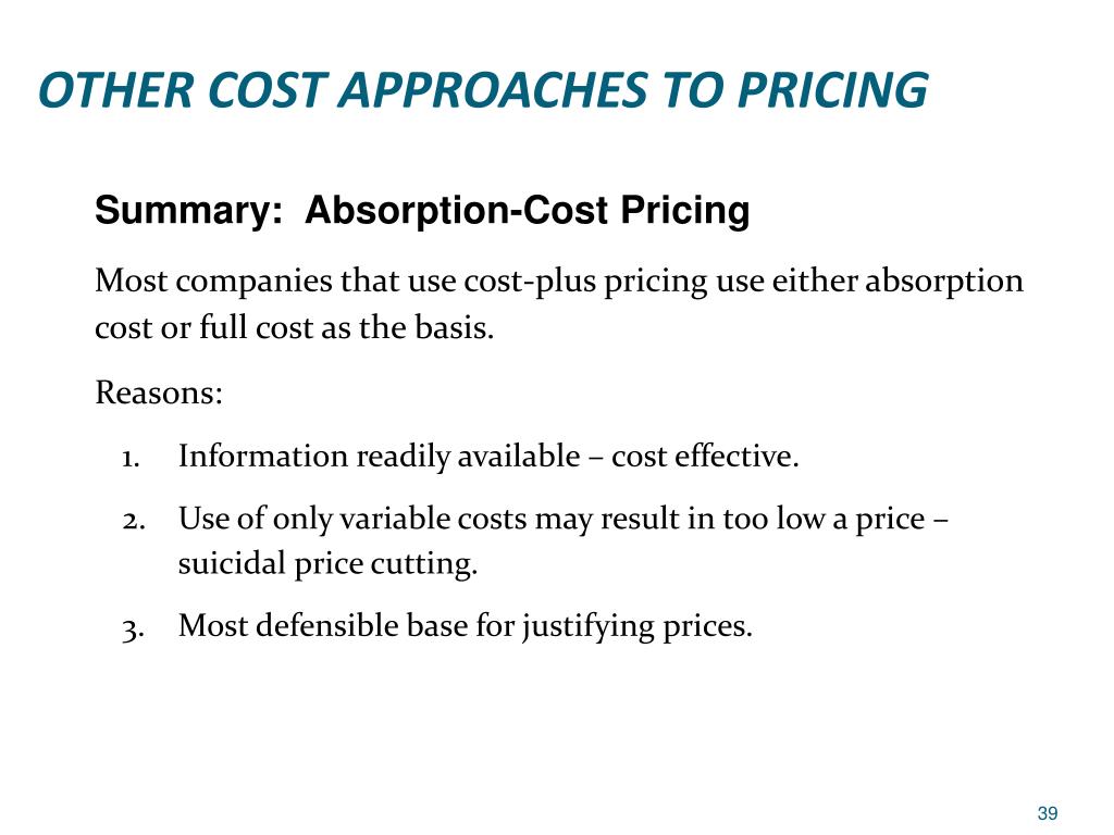 OTHER COST APPROACHES TO PRICING Most companies that use cost-plus pricing use either absorption cost or full cost as the basis. Reasons: • Information readily available – cost effective. • Use of only variable costs may result in too low a price – suicidal price cutting. • Most defensible base for justifying prices. Summary: Absorption-Cost Pricing
