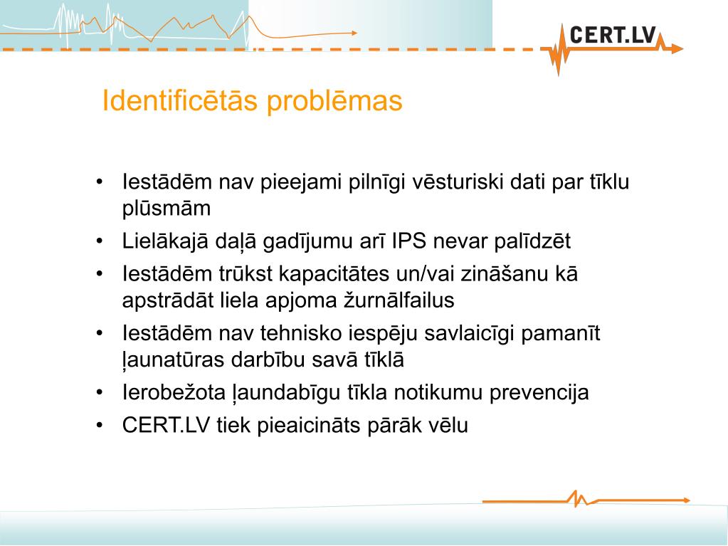 Identificētās problēmas • Iestādēm nav pieejami pilnīgi vēsturiski dati par tīklu plūsmām • Lielākajā daļā gadījumu arī IPS nevar palīdzēt • Iestādēm trūkst kapacitātes un/vai zināšanu kā apstrādāt liela apjoma žurnālfailus • Iestādēm nav tehnisko iespēju savlaicīgi pamanīt ļaunatūras darbību savā tīklā • Ierobežota ļaundabīgu tīkla notikumu prevencija • CERT.LV tiek pieaicināts pārāk vēlu
