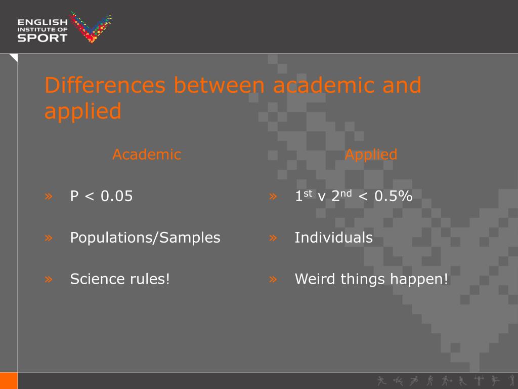Academic P < 0.05 Populations/Samples Science rules! Applied 1st v 2nd < 0.5% Individuals Weird things happen! Differences between academic and applied