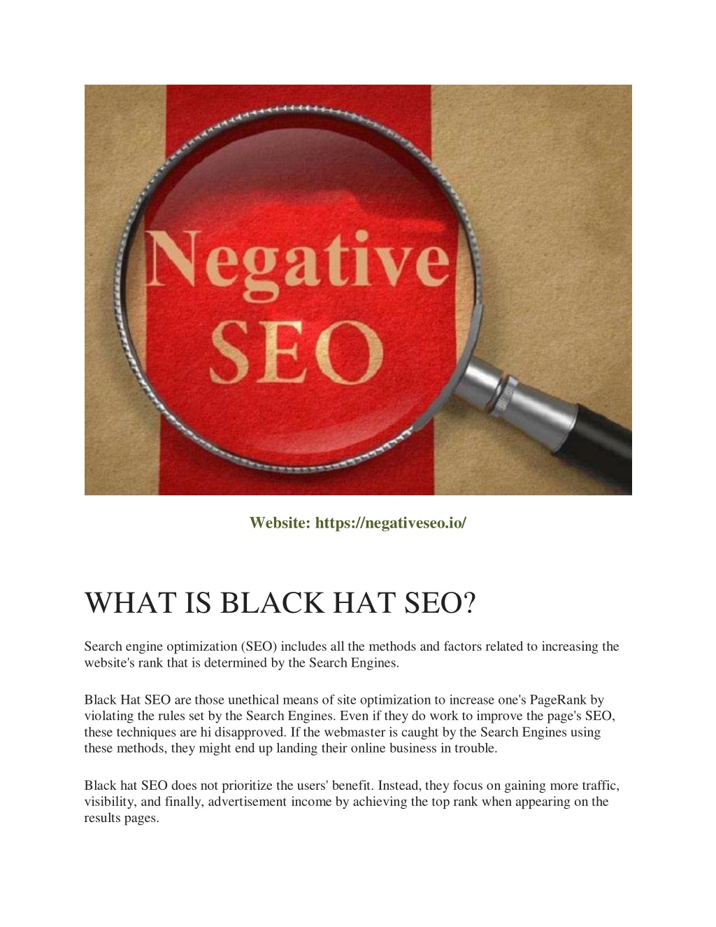 Website: https://negativeseo.io/ WHAT IS BLACK HAT SEO? Search engine optimization (SEO) includes all the methods and factors related to increasing the website's rank that is determined by the Search Engines. Black Hat SEO are those unethical means of site optimization to increase one's PageRank by violating the rules set by the Search Engines. Even if they do work to improve the page's SEO, these techniques are hi disapproved. If the webmaster is caught by the Search Engines using these methods, they might end up landing their online business in trouble. Black hat SEO does not prioritize the users' benefit. Instead, they focus on gaining more traffic, visibility, and finally, advertisement income by achieving the top rank when appearing on the results pages.