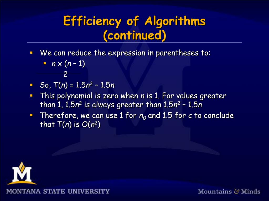 Efficiency of Algorithms (continued) • We can reduce the expression in parentheses to: • n x (n – 1) 2 • So, T(n) = 1.5n2 – 1.5n • This polynomial is zero when n is 1. For values greater than 1, 1.5n2 is always greater than 1.5n2 – 1.5n • Therefore, we can use 1 for n0 and 1.5 for c to conclude that T(n) is O(n2)