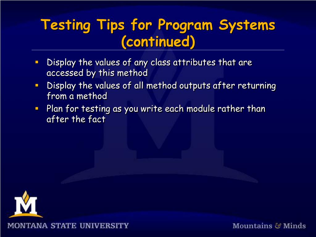 Testing Tips for Program Systems (continued) • Display the values of any class attributes that are accessed by this method • Display the values of all method outputs after returning from a method • Plan for testing as you write each module rather than after the fact