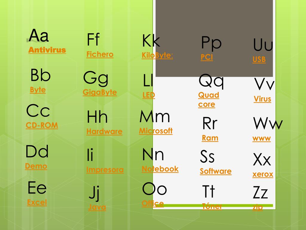 Aa Antivirus Ff Fichero Kk KiloByte: Pp PCI Uu USB Bb Byte Gg GigaByte Ll LED Qq Quad core Vv Virus Cc CD-ROM Mm Microsoft Hh Hardware Rr Ram Ww www Dd Demo Nn Notebook Ii Impresora Ss Software Xx xerox Ee Excel Oo Office Tt Tóner Jj Java Zz zip