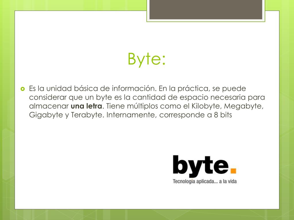 Byte: • Es la unidad básica de información. En la práctica, se puede considerar que un byte es la cantidad de espacio necesaria para almacenar una letra. Tiene múltiplos como el Kilobyte, Megabyte, Gigabyte y Terabyte. Internamente, corresponde a 8 bits