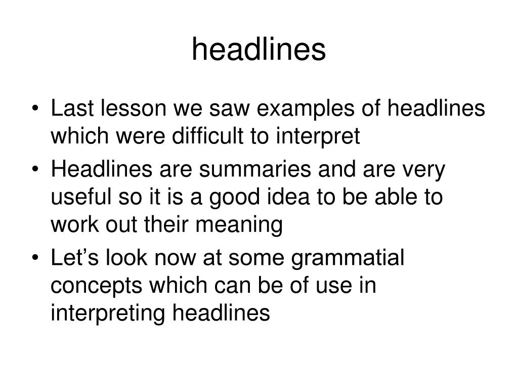 headlines • Last lesson we saw examples of headlines which were difficult to interpret • Headlines are summaries and are very useful so it is a good idea to be able to work out their meaning • Let’s look now at some grammatial concepts which can be of use in interpreting headlines