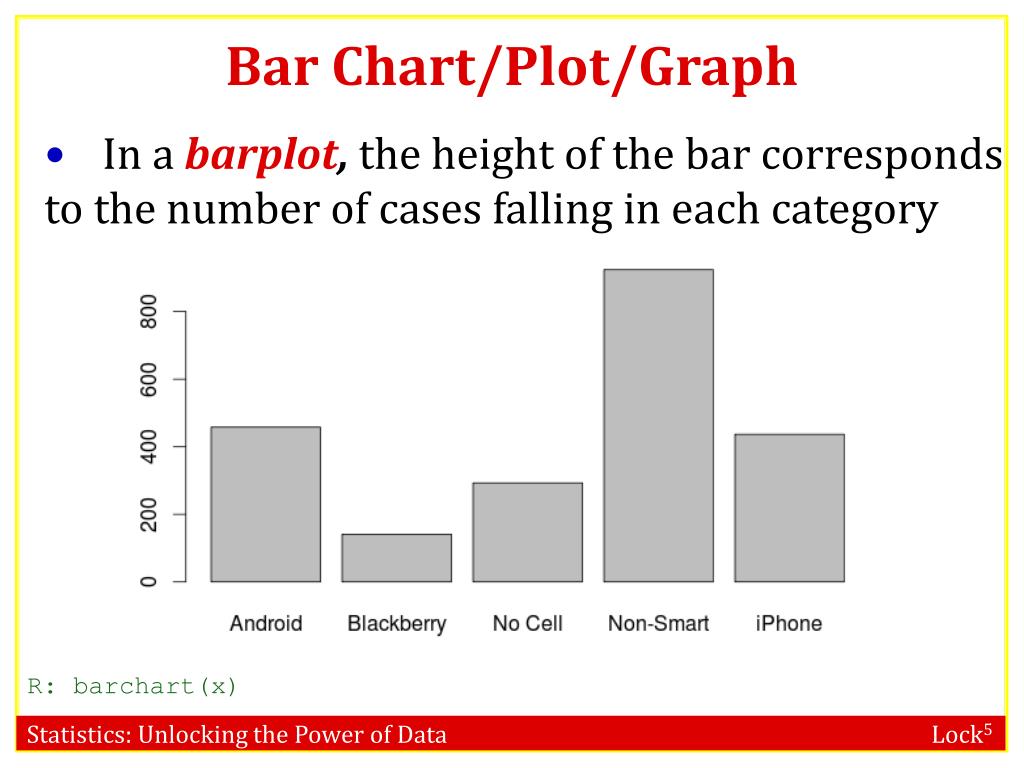 Bar Chart/Plot/Graph • In a barplot, the height of the bar corresponds to the number of cases falling in each category R: barchart(x)