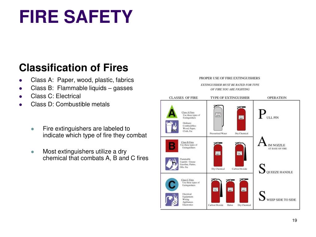 FIRE SAFETY Classification of Fires • Class A: Paper, wood, plastic, fabrics • Class B: Flammable liquids – gasses • Class C: Electrical • Class D: Combustible metals • Fire extinguishers are labeled to indicate which type of fire they combat • Most extinguishers utilize a dry chemical that combats A, B and C fires