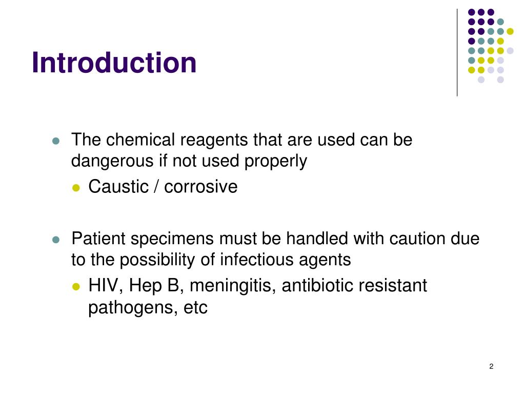Introduction • The chemical reagents that are used can be dangerous if not used properly • Caustic / corrosive • Patient specimens must be handled with caution due to the possibility of infectious agents • HIV, Hep B, meningitis, antibiotic resistant pathogens, etc
