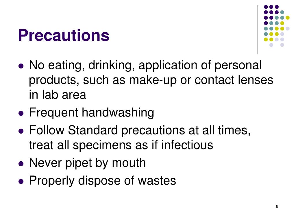 Precautions • No eating, drinking, application of personal products, such as make-up or contact lenses in lab area • Frequent handwashing • Follow Standard precautions at all times, treat all specimens as if infectious • Never pipet by mouth • Properly dispose of wastes