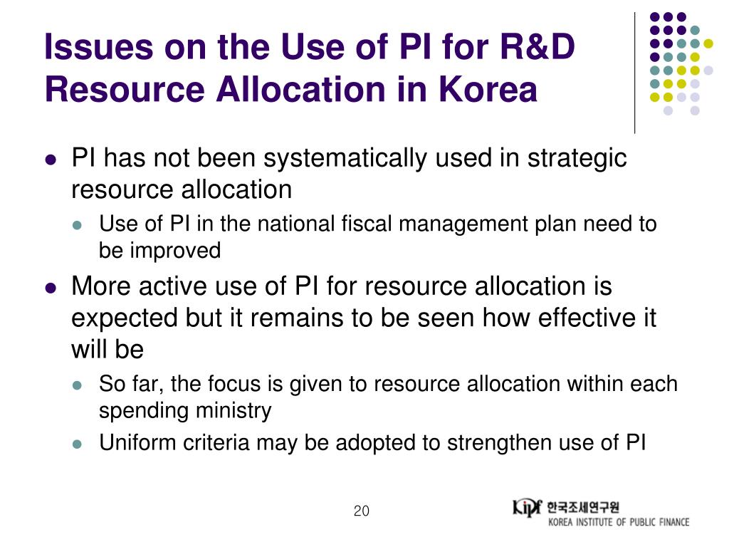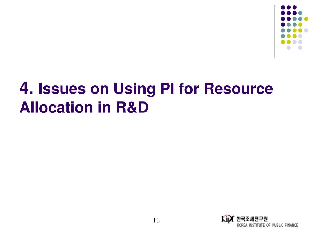 Contents • Performance information of R&D in Korea • Issues on performance information of R&D • Use of PI for resource allocation in R&D in Korea • Issues on the use of PI for resource allocation in R&D