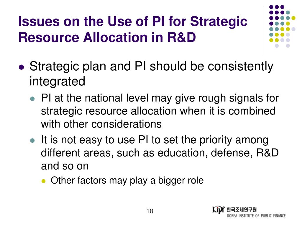 Use of PI for R&D Resource Allocation • Strategic resource allocation • Resource allocation among different areas, such as education, defense, R&D and so on • Resource allocation among R&D programs pursuing different goals • Resource allocation among R&D programs pursuing similar goals • Resource allocation among R&D programs within spending ministries/agencies