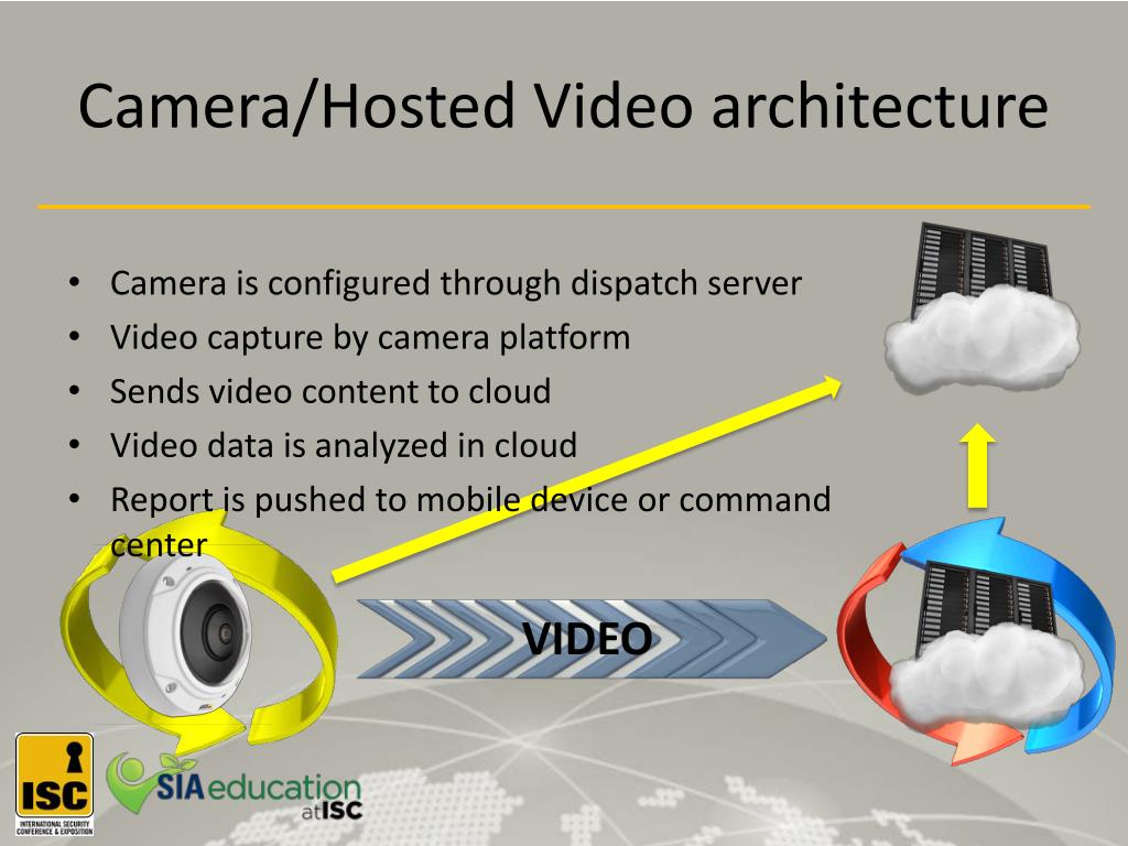 Camera/Hosted Video architecture • Camera is configured through dispatch server • Video capture by camera platform • Sends video content to cloud • Video data is analyzed in cloud • Report is pushed to mobile device or command center VIDEO