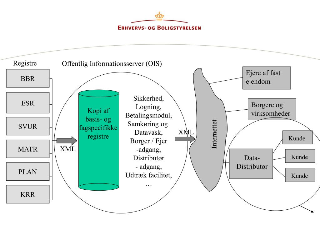 Registre Offentlig Informationsserver (OIS) BBR Ejere af fast ejendom Kopi afbasis- og fagspecifikke registre ESR Sikkerhed, Logning, Betalingsmodul, Samkøring og Datavask, Borger / Ejer -adgang, Distributør - adgang, Udtræk facilitet, … Borgere og virksomheder SVUR Internettet XML Kunde Kunde Kunde MATR XML Data- Distributør PLAN KRR Internettet
