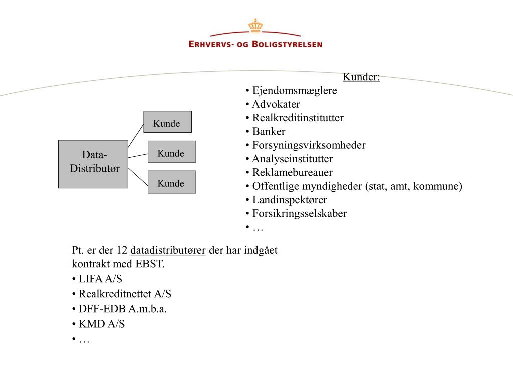 Data- Distributør Kunde Kunde Kunde • Kunder: • Ejendomsmæglere • Advokater • Realkreditinstitutter • Banker • Forsyningsvirksomheder • Analyseinstitutter • Reklamebureauer • Offentlige myndigheder (stat, amt, kommune) • Landinspektører • Forsikringsselskaber • … • Pt. er der 12 datadistributører der har indgået kontrakt med EBST. • LIFA A/S • Realkreditnettet A/S • DFF-EDB A.m.b.a. • KMD A/S • …