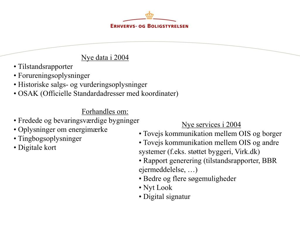 Nye data i 2004 • Tilstandsrapporter • Forureningsoplysninger • Historiske salgs- og vurderingsoplysninger • OSAK (Officielle Standardadresser med koordinater) • Forhandles om: • Fredede og bevaringsværdige bygninger • Oplysninger om energimærke • Tingbogsoplysninger • Digitale kort • Nye services i 2004 • Tovejs kommunikation mellem OIS og borger • Tovejs kommunikation mellem OIS og andre systemer (f.eks. støttet byggeri, Virk.dk) • Rapport generering (tilstandsrapporter, BBR ejermeddelelse, …) • Bedre og flere søgemuligheder • Nyt Look • Digital signatur
