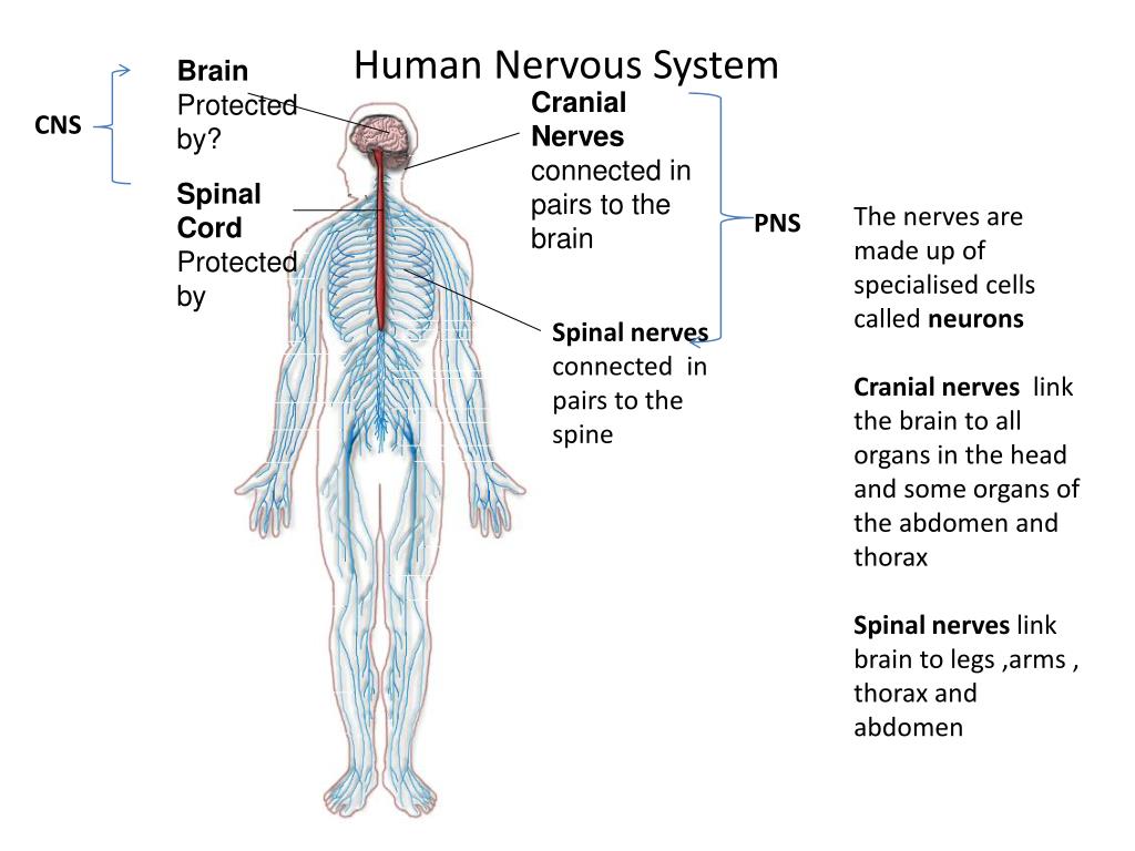 Human Nervous System Brain Protected by? i Cranial Nerves connected in pairs to the brain CNS Spinal Cord Protected by The nerves are made up of specialised cells called neurons Cranial nerves link the brain to all organs in the head and some organs of the abdomen and thorax Spinal nerves link brain to legs ,arms , thorax and abdomen PNS Spinal nerves connected in pairs to the spine .