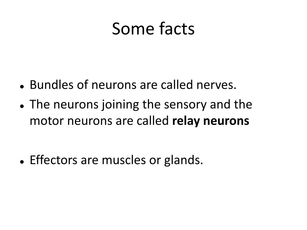 Some facts • Bundles of neurons are called nerves. • The neurons joining the sensory and the motor neurons are called relay neurons • Effectors are muscles or glands.