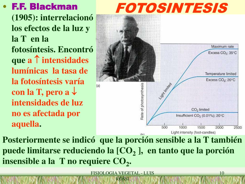FOTOSINTESIS • F.F. Blackman (1905): interrelacionó los efectos de la luz y la T en la fotosíntesis. Encontró que a intensidades lumínicas la tasa de la fotosíntesis varía con la T, pero a intensidades de luz no es afectada por aquella. Posteriormente se indicó que la porción sensible a la T también puede limitarse reduciendo la [CO2 ], en tanto que la porción insensible a la T no requiere CO2. FISIOLOGIA VEGETAL - LUIS ROSSI