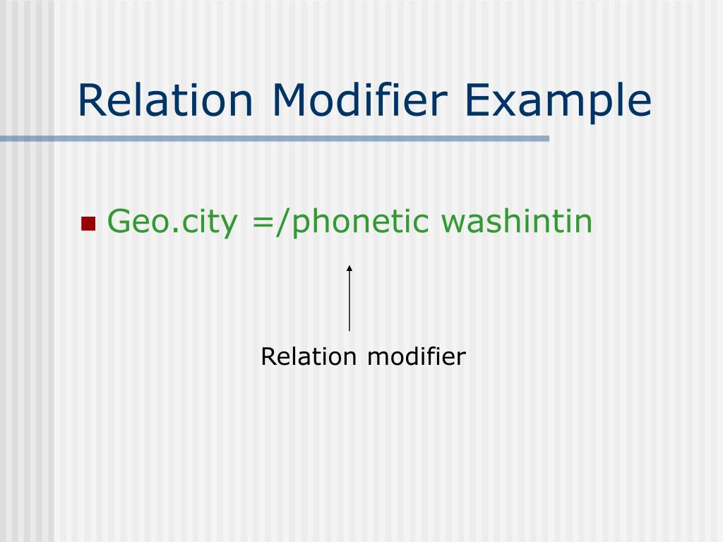 Relation Modifier Example • Geo.city =/phonetic washintin Relation modifier