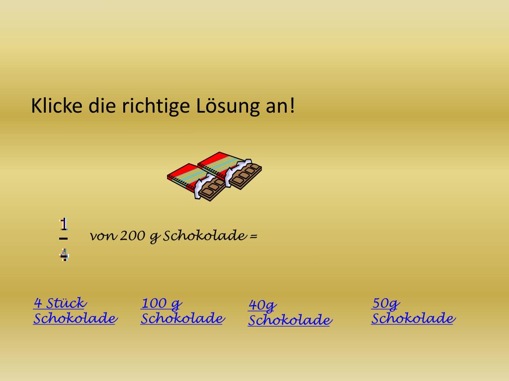 Klicke die richtige Lösung an! von 200 g Schokolade = 4 Stück Schokolade 100 g Schokolade 50g Schokolade 40g Schokolade