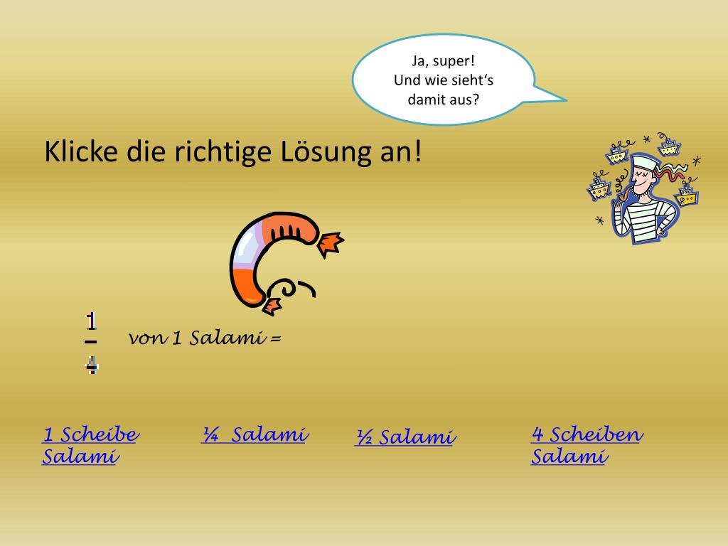 Ja, super! Und wie sieht‘s damit aus? Klicke die richtige Lösung an! von 1 Salami = 1 Scheibe Salami ¼ Salami 4 Scheiben Salami ½ Salami
