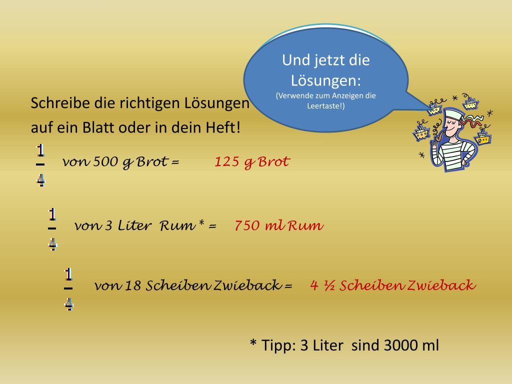 Ja, super! Und wie sieht‘s damit aus? Denk daran: du musst immer durch 4 teilen! Und jetzt die Lösungen: (Verwende zum Anzeigen die Leertaste!) Schreibe die richtigen Lösungen auf ein Blatt oder in dein Heft! von 500 g Brot = 125 g Brot von 3 Liter Rum * = 750 ml Rum von 18 Scheiben Zwieback = 4 ½ Scheiben Zwieback * Tipp: 3 Liter sind 3000 ml